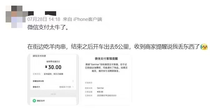 还有网友反馈,微信支付似乎出现了可以提醒付款人有遗失物的功能。